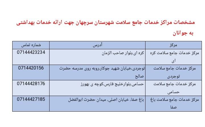 مشخصات مراکز خدمات جامع سلامت شهرستان سرچهان جهت ارائه خدمات بهداشتی به جوانان