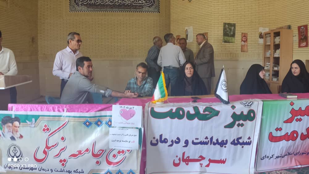 به گزارش روابط عمومی شبکه بهداشت و درمان شهرستان سرچهان، به مناسبت هفته دفاع مقدس و هم زمان با روز جهانی قلب، در راستای پیشگیری از بیماریهای قلبی عروقی میز خدمت این شبکه در مصلی نماز جمعه شهرستان سرچهان برگزار گردید.  در این برنامه خدمات متنوعی از جمله غربالگری فشار خون، مشاوره‌های بهداشتی و توزیع پمفلت‌های جوانی جمعیت در بین نمازگزاران ارائه شد.